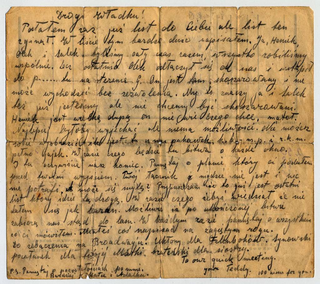Charles Kotkowsky, a prisoner of the Piotrkow labour camp, receives clandestine letters from the Jewish Fighting Organization in the Warsaw Ghetto. Smuggled out of the ghetto by messengers- one of them, Vladka Meed - they show how, in the most dangerous conditions, Jews organized, shared information and resources to resist and survive.