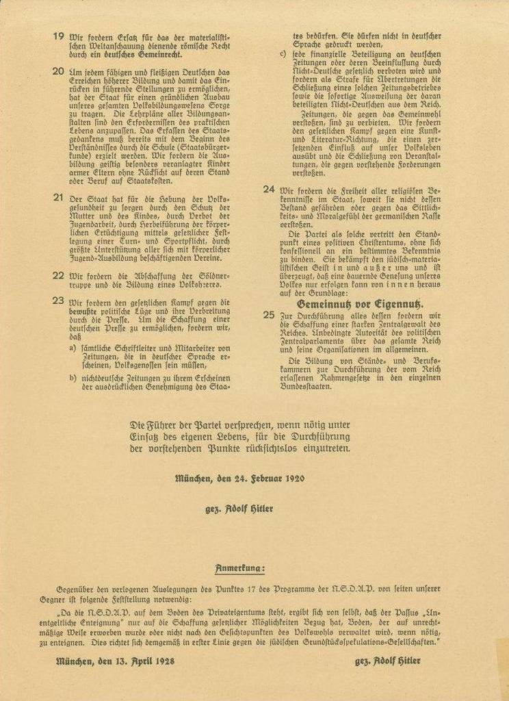 25-point program of National Socialist German Workers’ Party (Nationalsozialistische Deutsche Arbeiterpartei known as Nazi Party) is written.