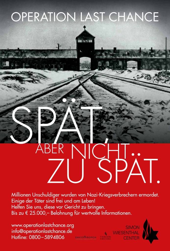 Under the slogan "Late But Not Too Late," the Wiesenthal Center launches a publicity campaign in Germany for Operation Last Chance II, which offers rewards of up to 25,000 euros for information which will help facilitate the prosecution in Germany of heretofore unprosecuted war criminals.