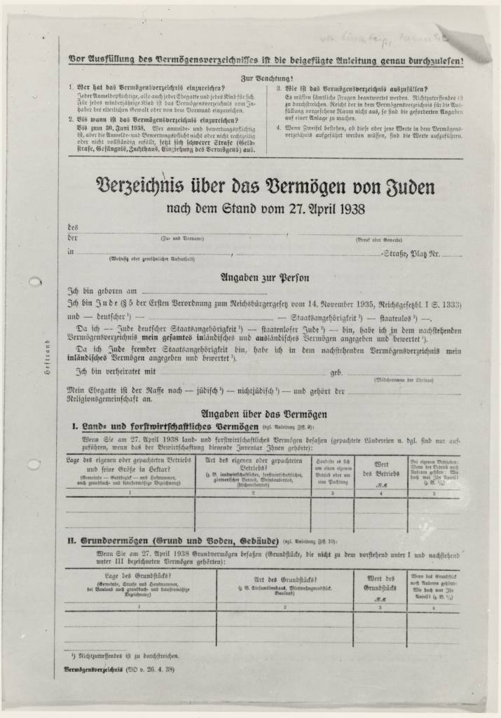 Nazis force Jews to register their assets, a first step toward total exclusion from the German economy. The Order for the Disclosure of Jewish Assets requires Jews to report all property in excess of 5,000 Reich marks.