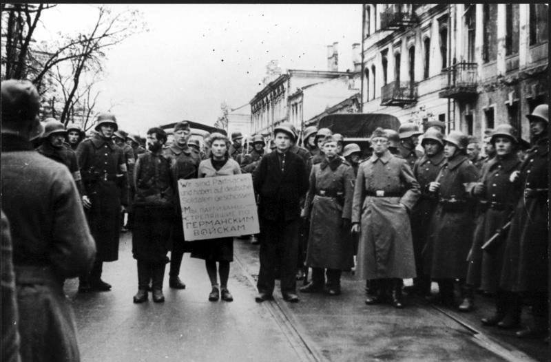In Minsk, Jewish underground fighter Masha Bruskina and fellow partisans are hanged by the Germans, their bodies left dangling for days, to discourage other resistance activity.
