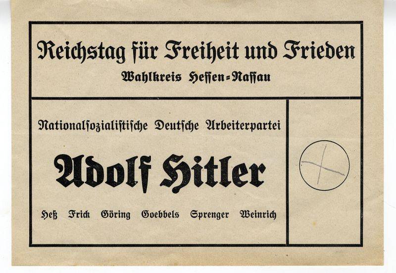 First federal parliamentary election under Nazi Party rule. By this time, all opposition parties had been banned. Voters are presented with a single list containing only Nazi Party members and non-party "guests" that fully support the Hitler regime. In spite of this climate of terror, 3.3 million voters submit invalid ballots to protest against the regime. The new Reichstag (German parliament) is exclusively composed of NSDAP members and sympathisers. On the same day, a referendum takes place about Hitler's decision to pull Germany out of the League of Nations. Officially, the measure is approved by 95.1% of voters.